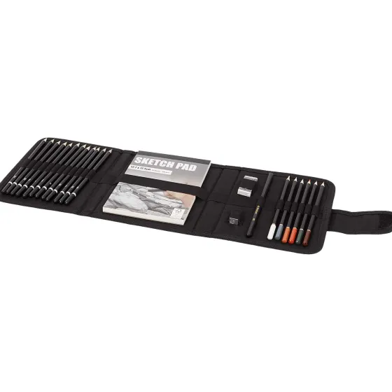 - Bevat 12 Schetspotloden, 1 Schetsblok, 1 Gum, 1 Puntenslijper, 1 Houtskoolpotlood, 6 Kleurpotloden En 1 Handige Tas